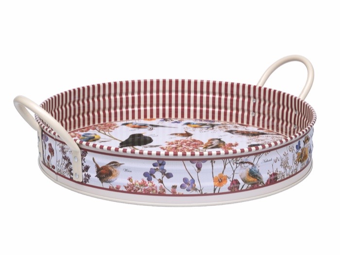 Fin bricka i plåt med fåglar på.