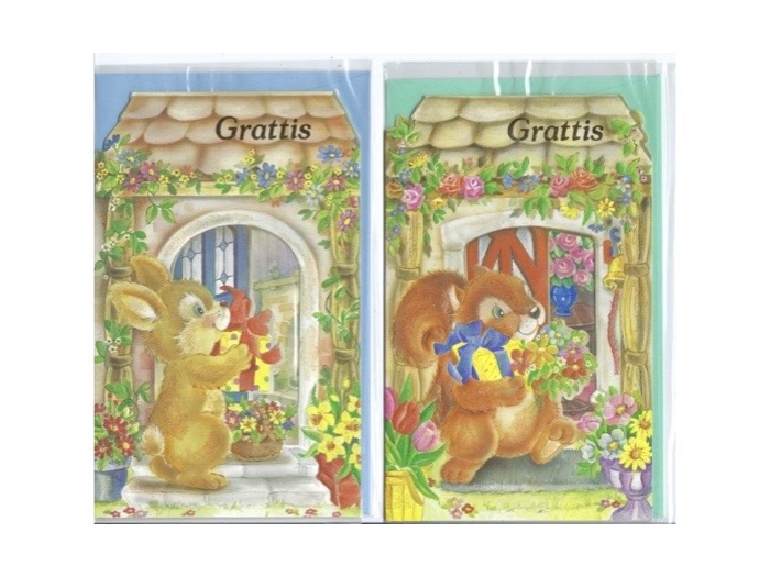 2-olika. Kortet har glitter och texten “Grattis” i guldfolie. Kuvert medföljer
