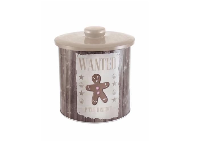 En dekorativ kakburk med lock i lantlig stil, prydd med ett “Wanted”-motiv och en pepparkaksgubbe på framsidan.