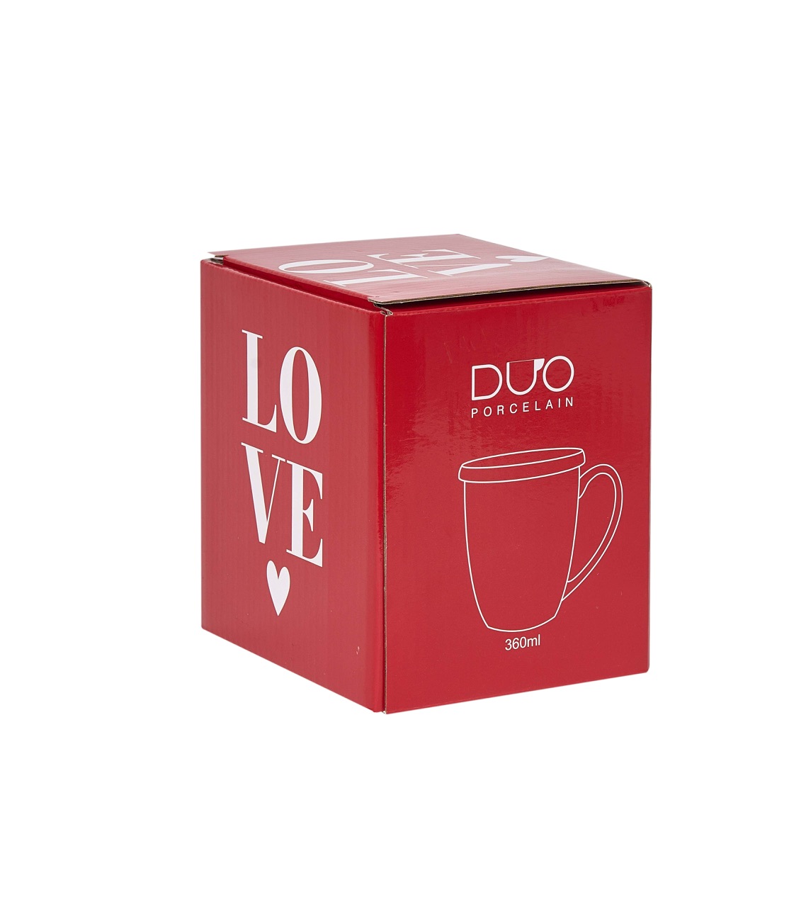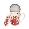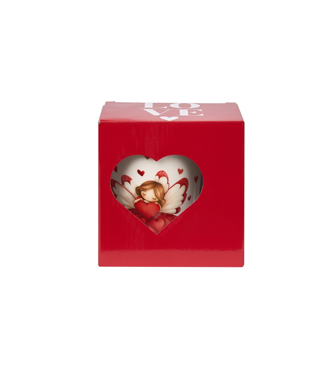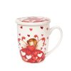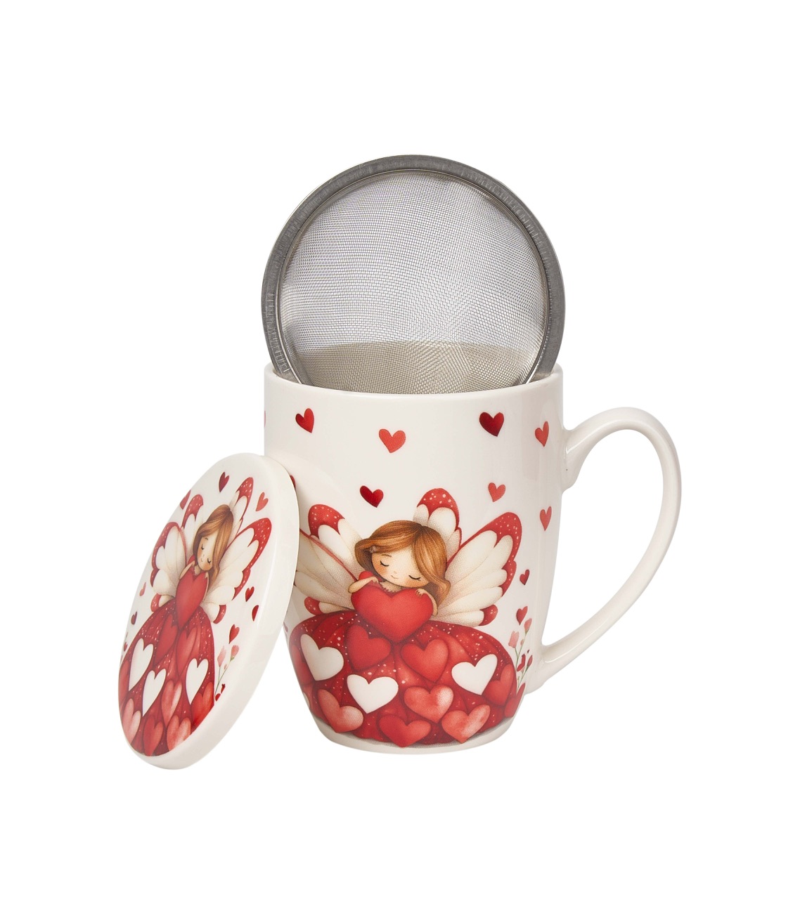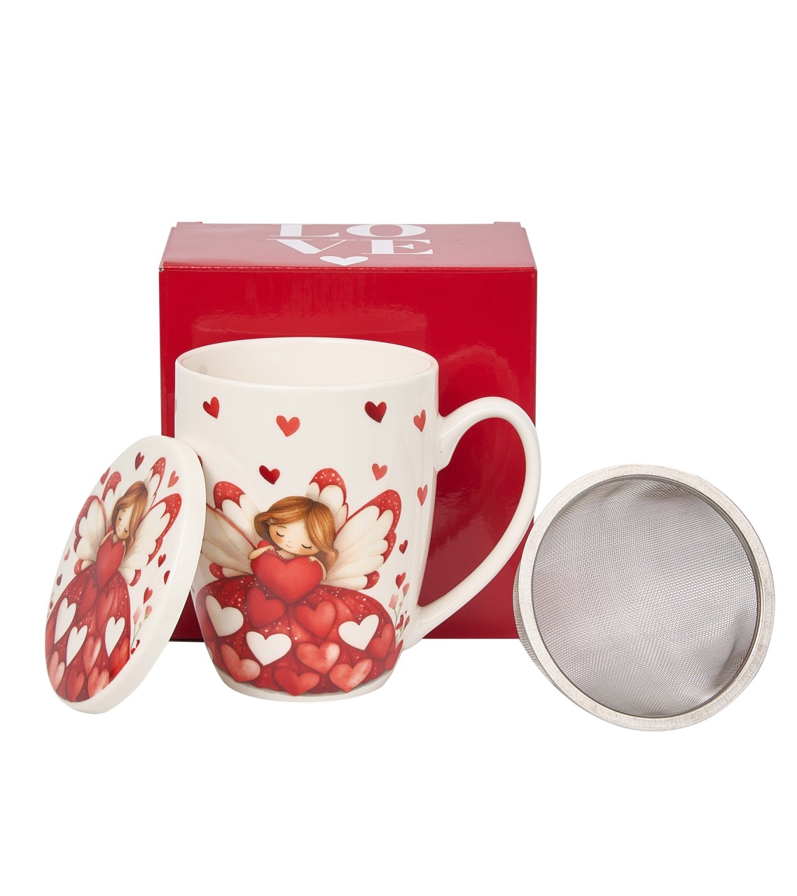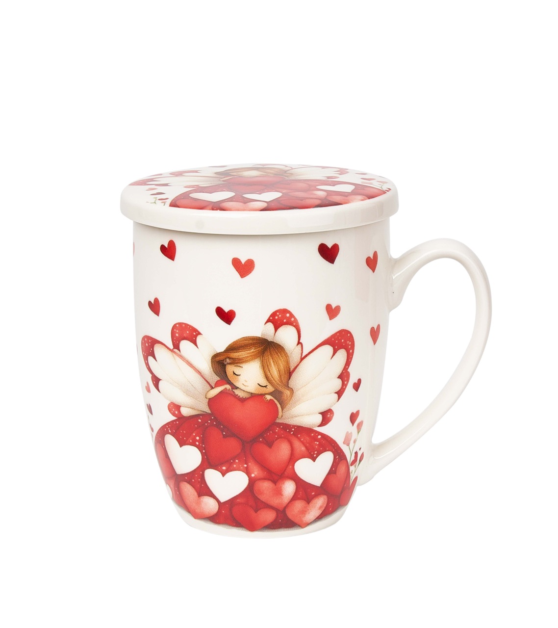 En porslinsmugg utav materialet New Bone China med romantiskt motiv av en ängel bland röda hjärtan, med matchande lock och tesil. Tål Maskindisk & Micro. Medföljer en fin presentförpackning.